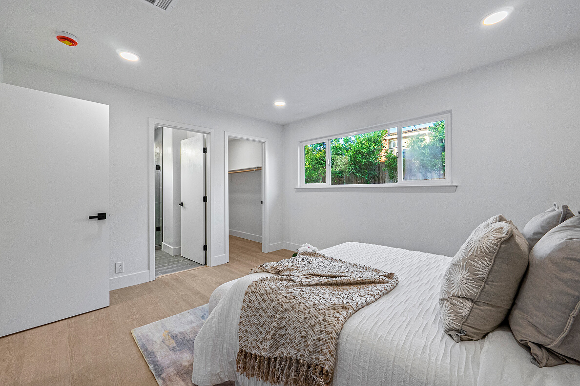 Crisp white siding, black garage, and a warm wood door define this clean, solar-equipped home in San Jose. A drought-friendly front yard and fresh, neutral interior bring both sustainability and comfort.