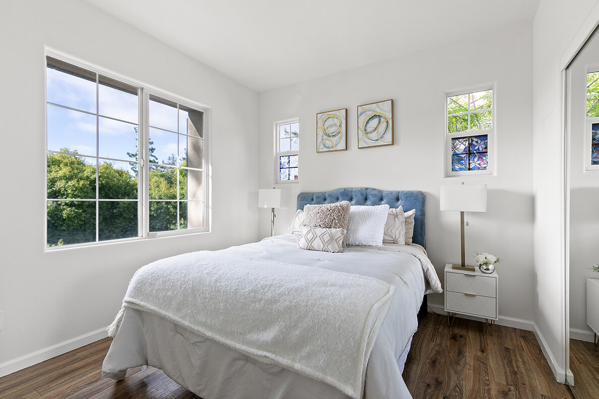 Balanced tones, structured landscaping, and a private setting define this Hayward residence. Blue shutters, a climbing vine entry, and simple lines create a welcoming yet grounded aesthetic.